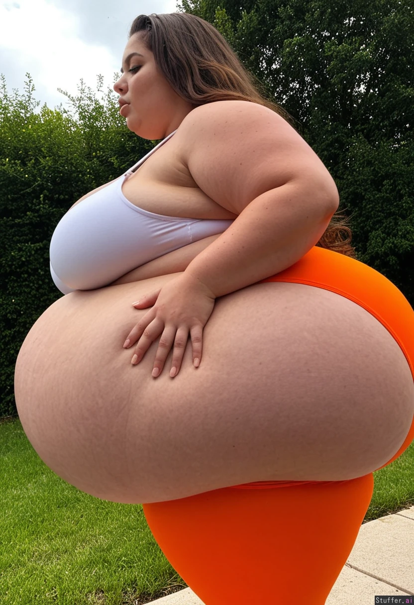 Tall tan woman standing outside Long flowing brown hair blowing in wind Tan skin Bright orange leggings White bra (Side profile view) (Large massive cleavage) (Skinny waist) (((Massive gigantic extra Thick hips))) (((Massive gigantic extra Wide hips))) (thick thighs) ((Giant round belly))