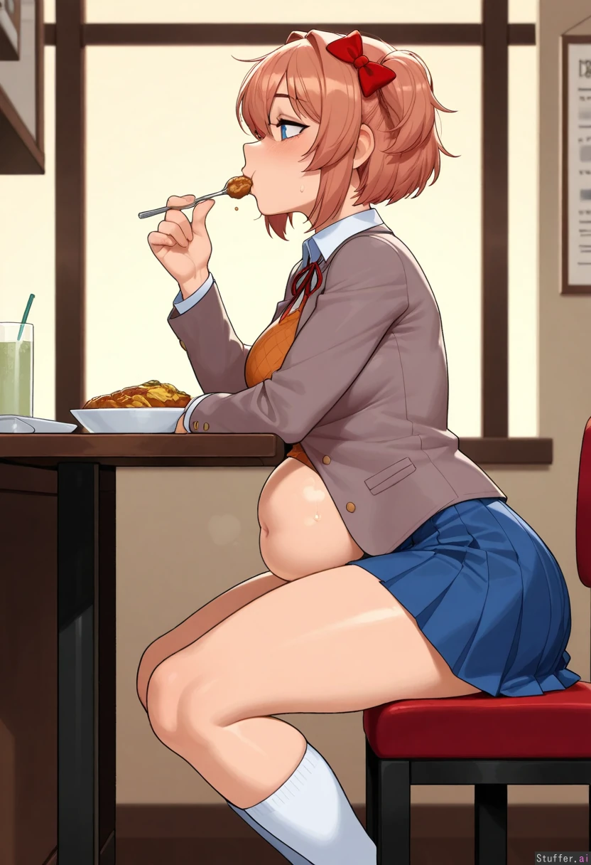 krekkov(artists), KAMII MOMORU(artist) beautiful shading, highly detailed, best quality, perfect anatomy, perfect proportions, perfect lighting, Solo, (adult), (Sayori from Doki Doki Literature Club), mascara, (side view) white socks, uniform, blue skirt, (Restaurant), (eating), (chewing), (gluttony), (skinny body: 1.0), (massive flattering belly, potbelly: 1.1), (medium breasts:1.0), (Chubby bloated belly: 0.0), (Bloated belly: 0.0),