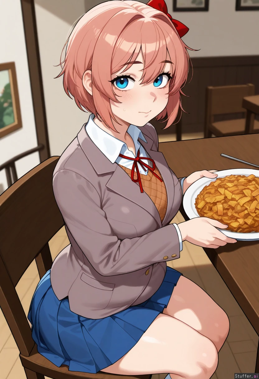krekkov(artists), KAMII MOMORU(artist) beautiful shading, highly detailed, best quality, perfect anatomy, perfect proportions, perfect lighting, Solo, (adult), (Sayori from Doki Doki Literature Club), blue eyes, mascara, (cute face) white socks, uniform, blue skirt, (Restaurant), (a table of food), (hungry), (plump body: 1.0), (massive flattering belly, potbelly: 0.0), (medium breasts:1.0), (Chubby bloated belly: 0.0), (Soft belly: 1.0),