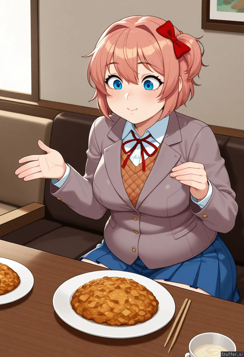 krekkov(artists), KAMII MOMORU(artist) beautiful shading, highly detailed, best quality, perfect anatomy, perfect proportions, perfect lighting, Solo, (adult), (Sayori from Doki Doki Literature Club), blue eyes, mascara, (cute face) white socks, uniform, blue skirt, (tight uniform), (Restaurant), (a table of food), (hungry), (obese body: 1.0), (massive flattering belly, potbelly: 0.0), (medium breasts:1.0), (Double_chin:1.2),
