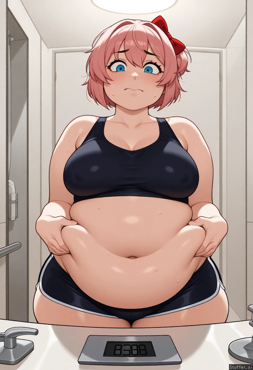 krekkov(artists), KAMII MOMORU(artist), beautiful shading, highly detailed, best quality, perfect anatomy, perfect proportions, perfect lighting, Solo, (cute face), (Sayori from Doki Doki Literature Club), short pink hair, mascara, tight crop top, tight mini pants, Bathroom, weighing scale, (weighing herself), (worried), (pinching belly), (obese body: 1.2), (massive flattering belly, potbelly: 0.0), (medium breasts:1.0), (Double_chin: 1.2), (Soft belly: 1.2),