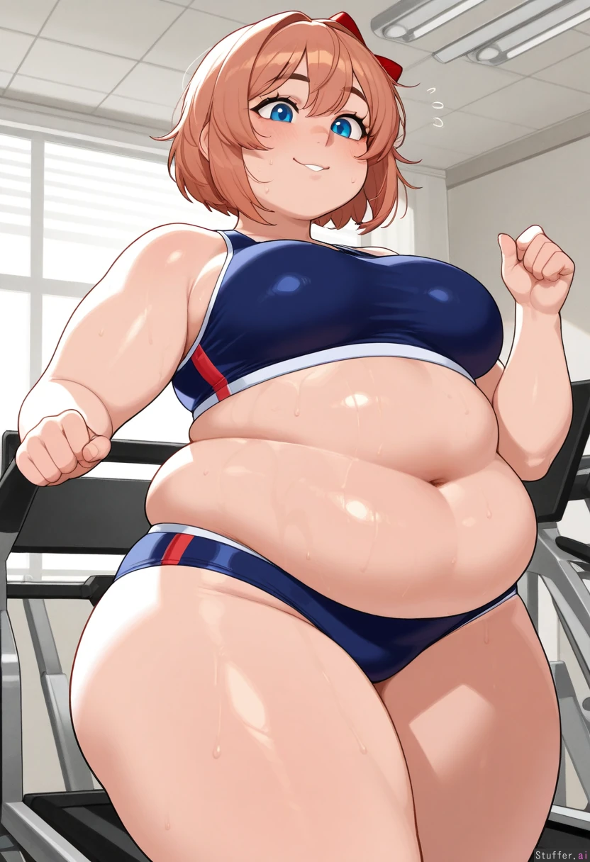 krekkov(artists), KAMII MOMORU(artist) beautiful shading, highly detailed, best quality, perfect anatomy, perfect proportions, perfect lighting, Solo, (cute face), Sayori from Doki Doki Literature Club, blue eyes, mascara, tight sports bikini, (Fitness centre), (Running on a treadmill), (sweaty), (obese body: 1.2), (massive flattering belly, potbelly: 0.0), (medium breasts:1.0), (Soft belly: 1.2), (Double_chin: 1.2),