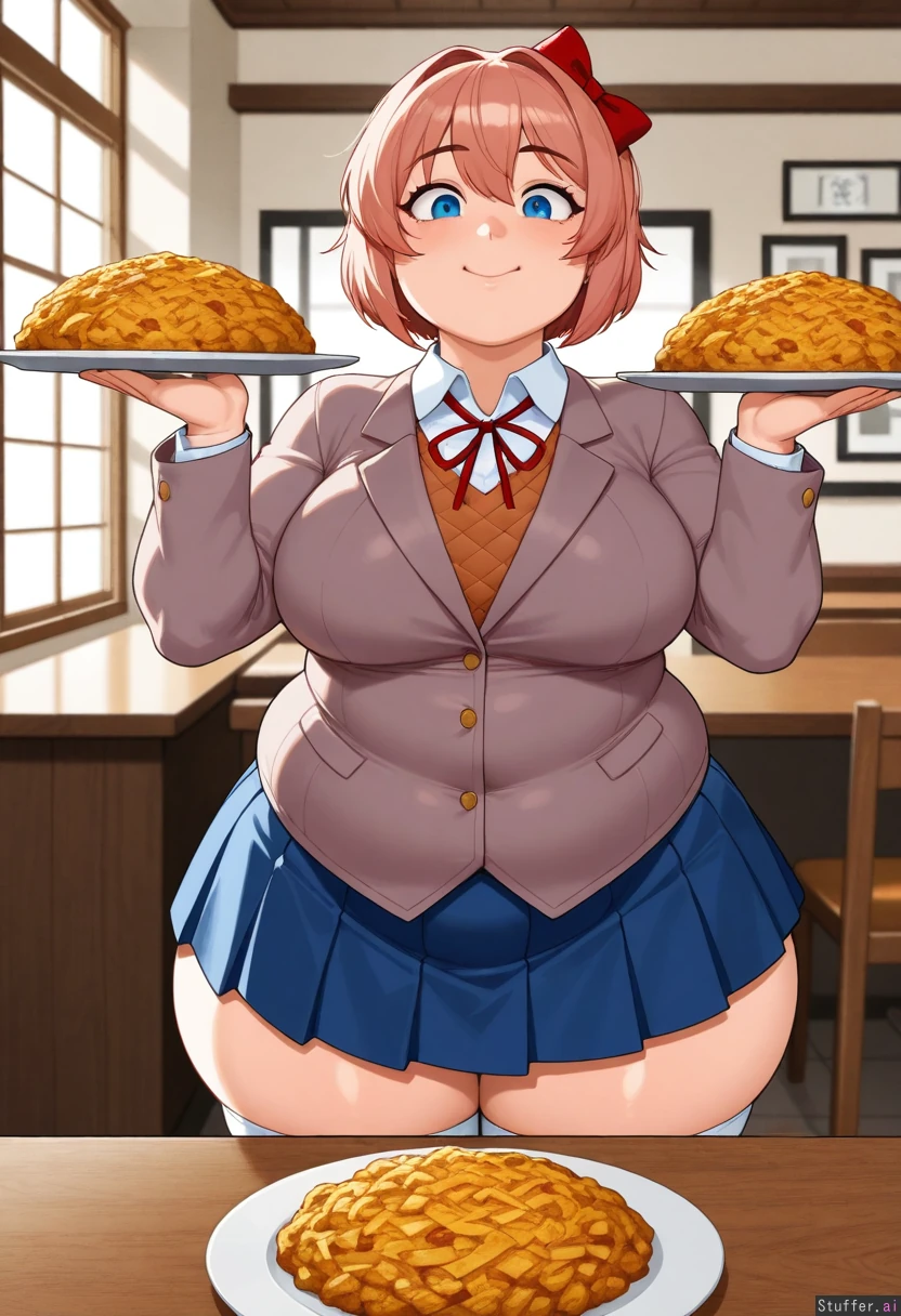krekkov(artists), KAMII MOMORU(artist) beautiful shading, highly detailed, best quality, perfect anatomy, perfect proportions, perfect lighting, Solo, (adult), (Sayori from Doki Doki Literature Club), blue eyes, mascara, (cute face) white socks, uniform, blue skirt, (tight uniform), (Restaurant), (a table of food), (hungry), (obese body: 1.1), (massive flattering belly, potbelly: 0.0), (medium breasts:1.0), (Double_chin:1.2),