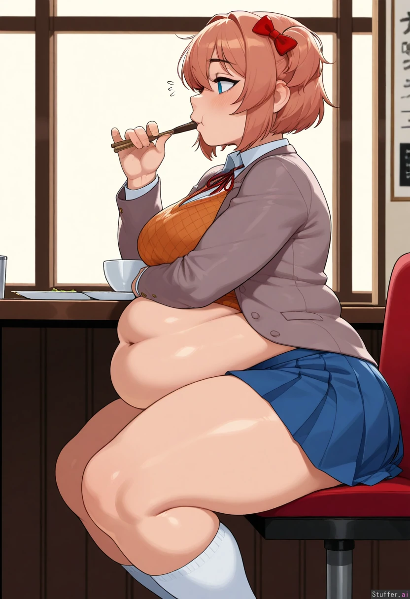 krekkov(artists), KAMII MOMORU(artist) beautiful shading, highly detailed, best quality, perfect anatomy, perfect proportions, perfect lighting, Solo, (adult), (Sayori from Doki Doki Literature Club), mascara, (side view) white socks, uniform, blue skirt, (Restaurant), (eating), (chewing), (gluttony), (obese body: 1.2), (massive flattering belly, potbelly: 0.0), (medium breasts:1.0), (Chubby bloated belly: 0.0), (Soft belly: 1.2),
