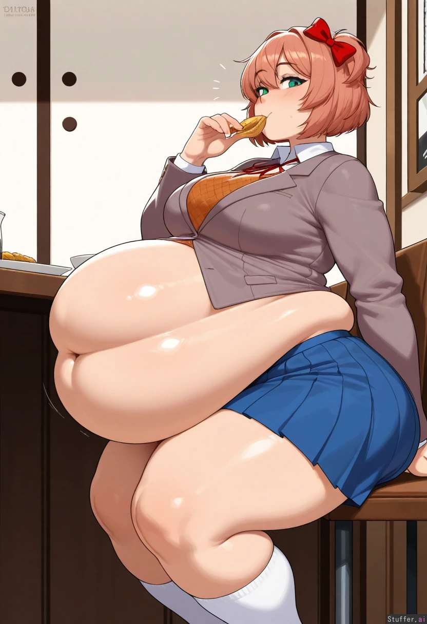 krekkov(artists), KAMII MOMORU(artist) beautiful shading, highly detailed, best quality, perfect anatomy, perfect proportions, perfect lighting, Solo, (adult), (Sayori from Doki Doki Literature Club), mascara, (side view) white socks, uniform, blue skirt, (Restaurant), (eating), (chewing), (gluttony), (obese body: 1.2), (massive flattering belly, potbelly: 1.4), (medium breasts:1.0), (Chubby bloated belly: 0.0), (Soft belly: 1.2),