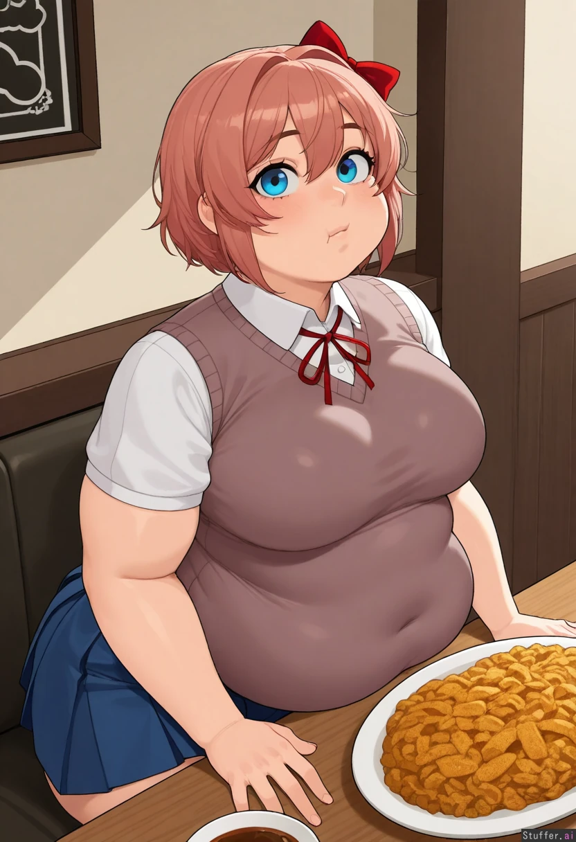 krekkov(artists), KAMII MOMORU(artist) beautiful shading, highly detailed, best quality, perfect anatomy, perfect proportions, perfect lighting, Solo, (adult), (Sayori from Doki Doki Literature Club), blue eyes, mascara, cute face white socks, uniform, blue skirt, (tight uniform), (Restaurant), (a table of food), (hungry), (obese body: 1.2), (massive flattering belly, potbelly: 0.0), (medium breasts:1.0), (Double_chin:1.2),