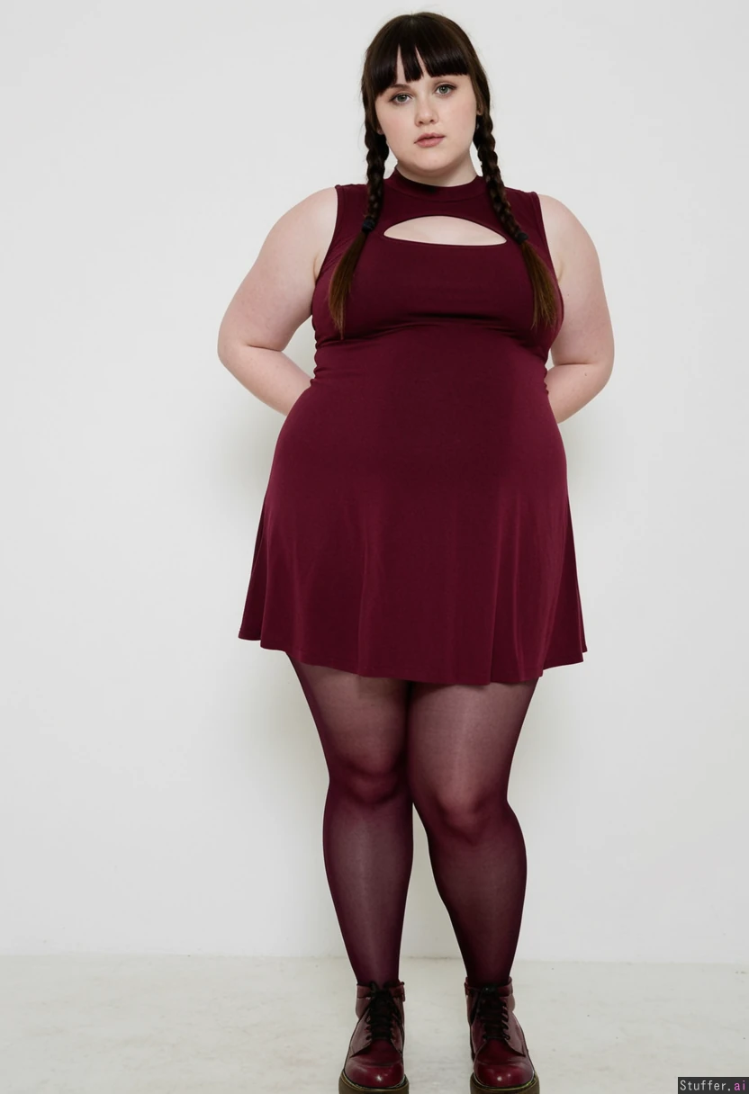 Cute meaty girlfriend, long straight dark hair with bangs and braid, sleeveless short burgundy tight dress, dark pantyhose, burgundy dr martens, standing, thin legs, narrow hips, narrow waist, large shoulders, small perky tits, doughy belly, chubby arms, high resolution image, fashion photography set, white background, glamour pose, pale skin, (Thin:0.0) (Morbidly obese:1.25)