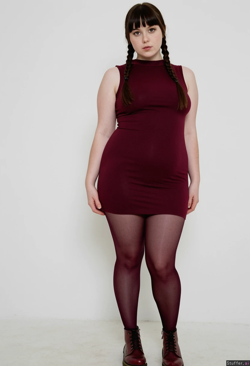 Cute meaty girlfriend, long straight dark hair with bangs and braid, sleeveless short burgundy tight dress, dark pantyhose, burgundy dr martens, standing, thin legs, narrow hips, narrow waist, large shoulders, small perky tits, doughy belly, chubby arms, high resolution image, fashion photography set, white background, glamour pose, pale skin, (Thin:0.0) (Morbidly obese:1.1)