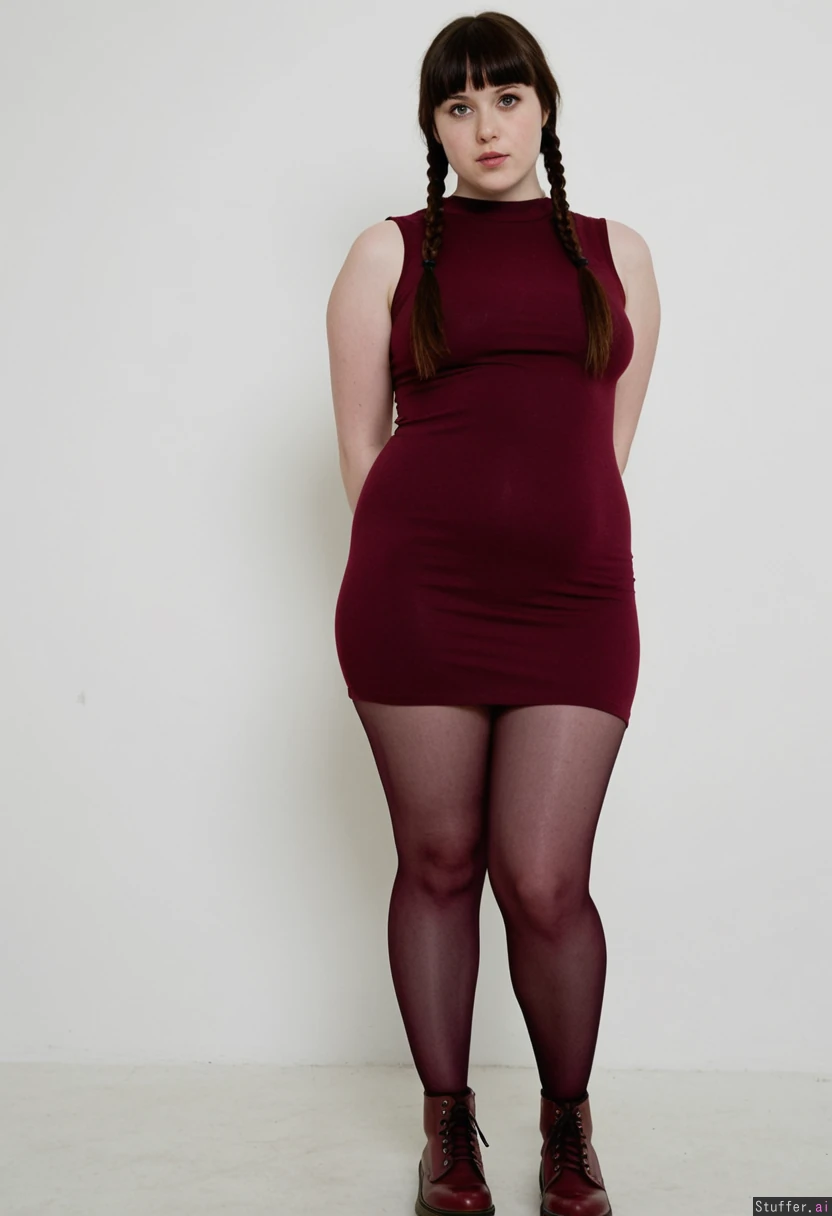 Cute meaty girlfriend, long straight dark hair with bangs and braid, sleeveless short burgundy tight dress, dark pantyhose, burgundy dr martens, standing, thin legs, narrow hips, narrow waist, large shoulders, small perky tits, doughy belly, chubby arms, high resolution image, fashion photography set, white background, glamour pose, pale skin, (Thin:0.0) (Morbidly obese:1.05)