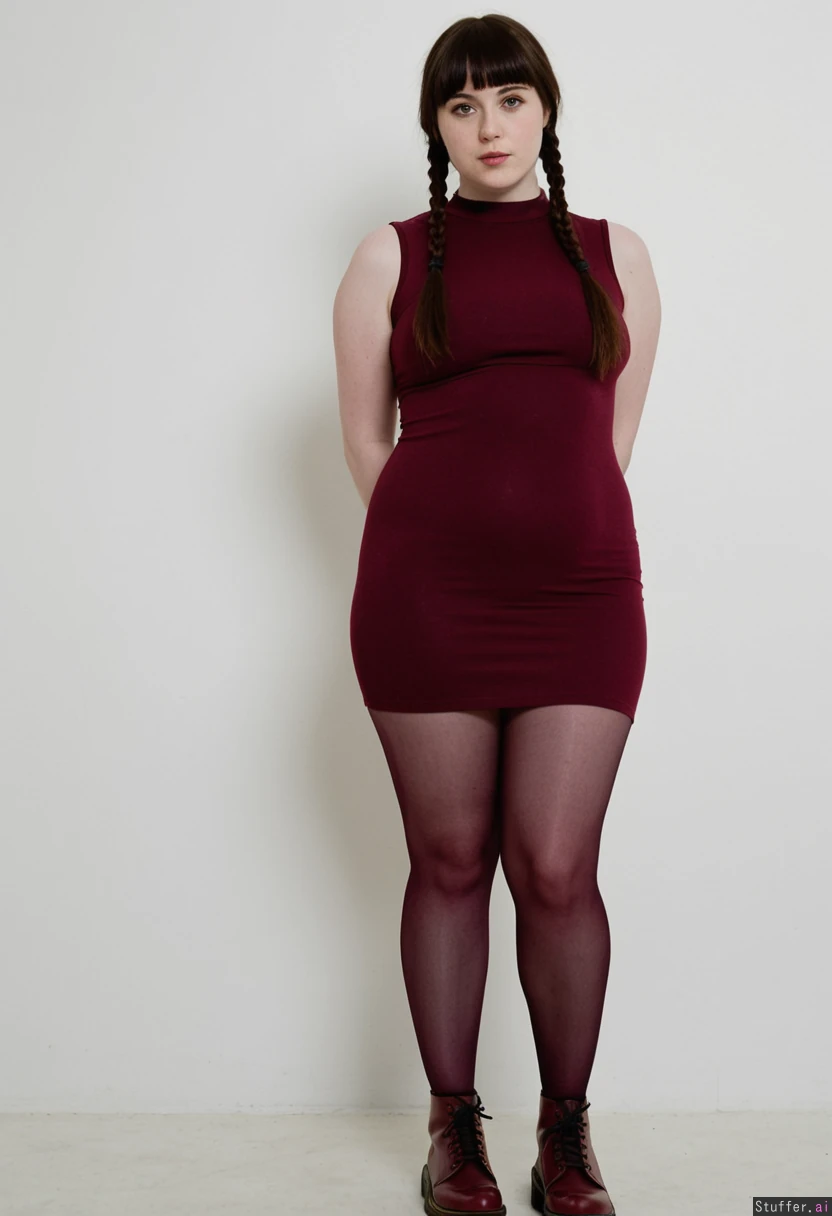 Cute meaty girlfriend, long straight dark hair with bangs and braid, sleeveless short burgundy tight dress, dark pantyhose, burgundy dr martens, standing, thin legs, narrow hips, narrow waist, large shoulders, small perky tits, doughy belly, chubby arms, high resolution image, fashion photography set, white background, glamour pose, pale skin, (Thin:0.0) (Morbidly obese:1.0)