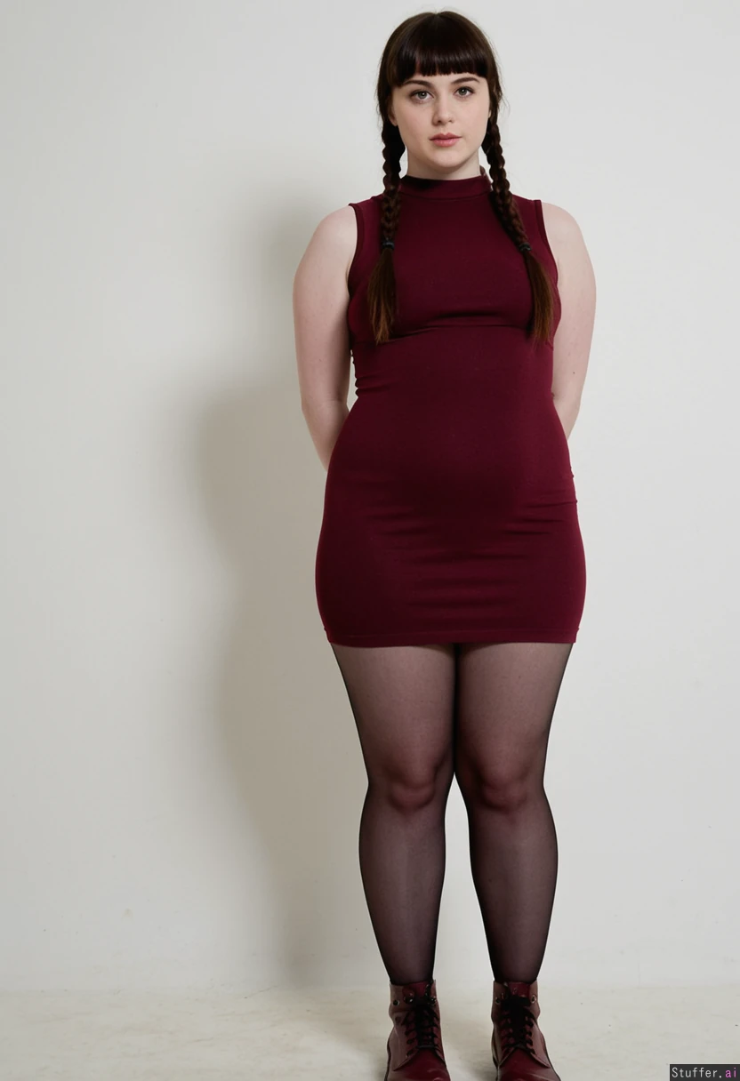 Cute meaty girlfriend, long straight dark hair with bangs and braid, sleeveless short burgundy tight dress, dark pantyhose, burgundy dr martens, standing, thin legs, narrow hips, narrow waist, large shoulders, small perky tits, doughy belly, chubby arms, high resolution image, fashion photography set, white background, glamour pose, pale skin, (Thin:0.0) (Morbidly obese:0.9)