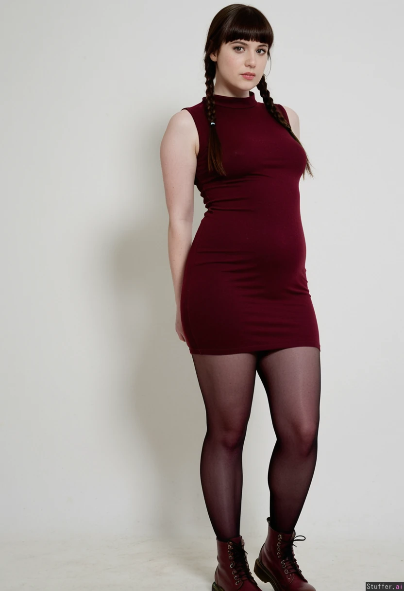 Cute meaty girlfriend, long straight dark hair with bangs and braid, sleeveless short burgundy tight dress, dark pantyhose, burgundy dr martens, standing, thin legs, narrow hips, narrow waist, large shoulders, small perky tits, doughy belly, chubby arms, high resolution image, fashion photography set, white background, glamour pose, pale skin, (Thin:1.15) (Morbidly obese:0.0)