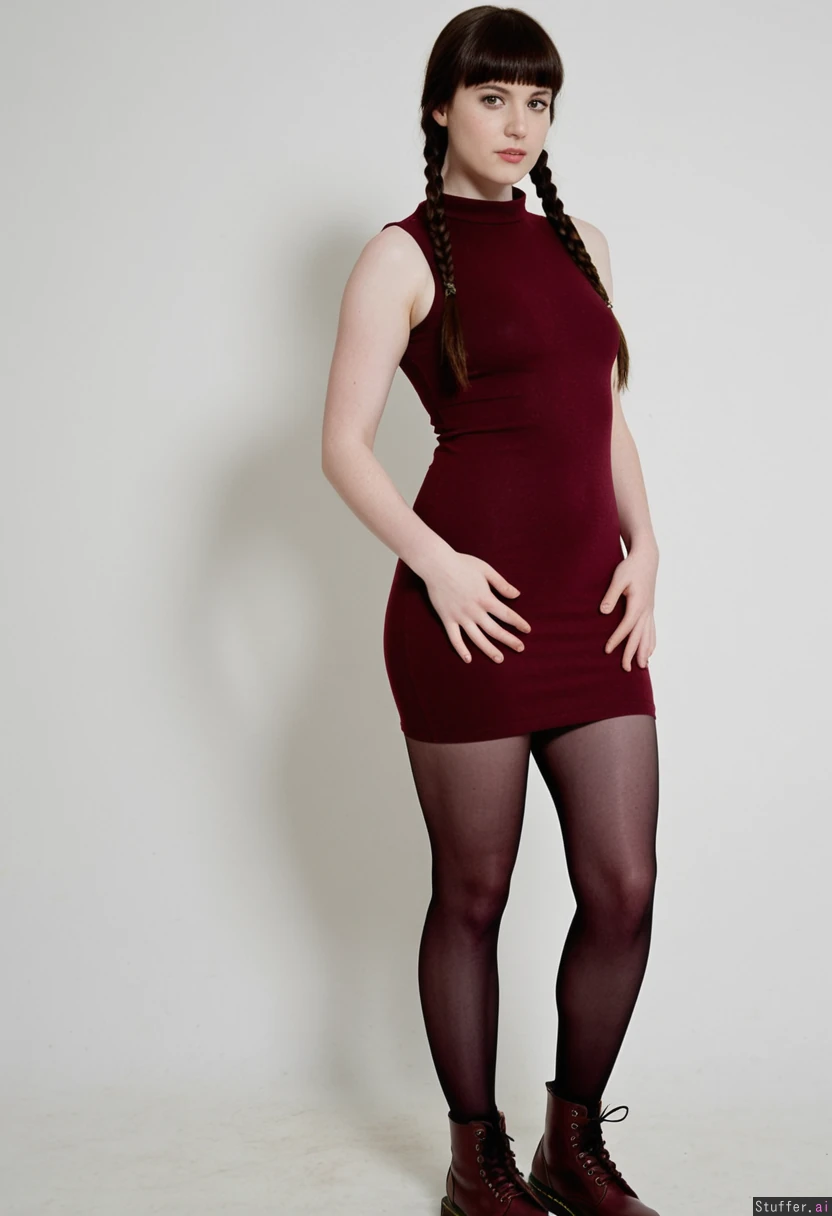 Cute meaty girlfriend, long straight dark hair with bangs and braid, sleeveless short burgundy tight dress, dark pantyhose, burgundy dr martens, standing, thin legs, narrow hips, narrow waist, large shoulders, small perky tits, doughy belly, chubby arms, high resolution image, fashion photography set, white background, glamour pose, pale skin, (Thin:1.25) (Morbidly obese:0.0)