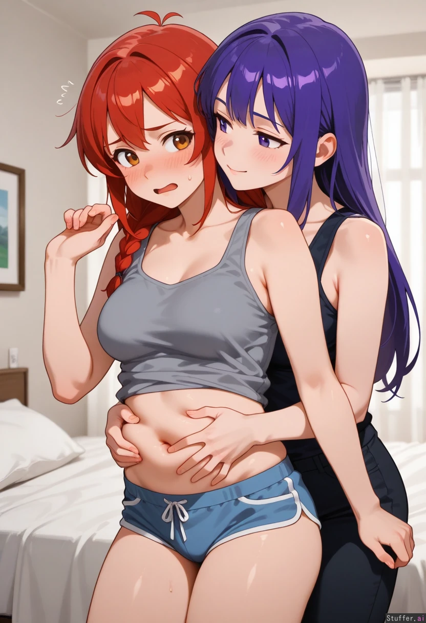 Lesbian_couple, Yuri, grabbing_belly, Aroused, embarrassed, red_hair, indigo_hair, ((Chubby_belly: 0.4))