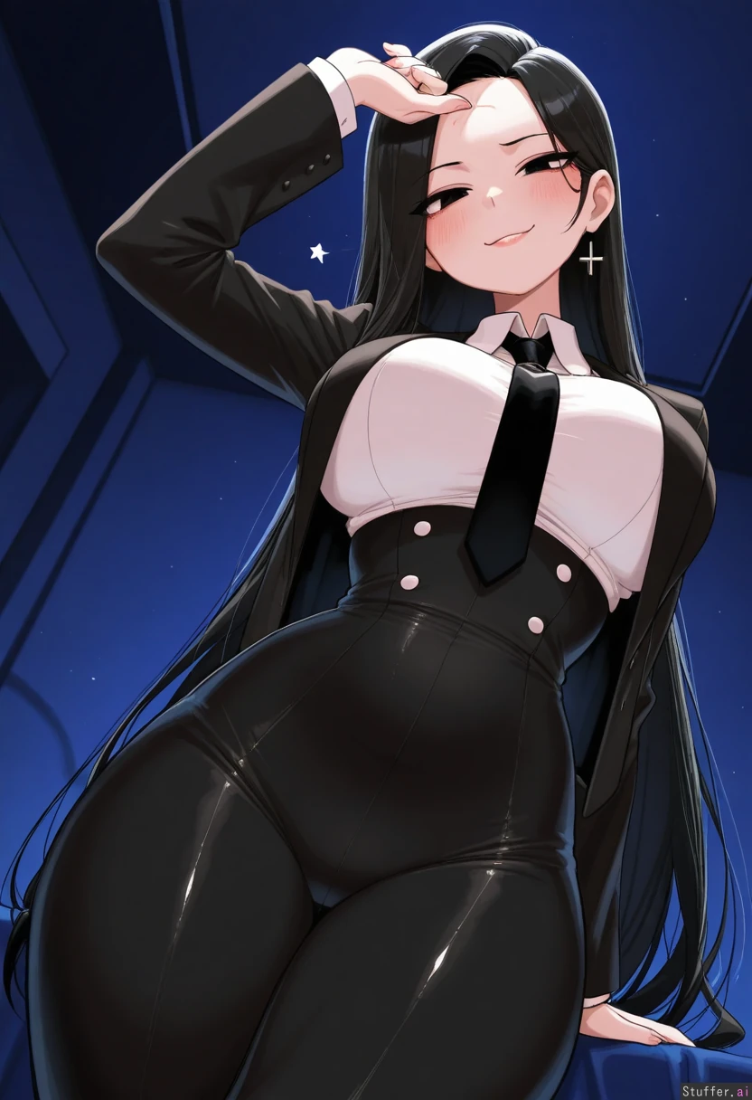 absurdres, 8k, perfect anatomy, masterpiece, beautiful face, beautiful eyes, RockSolidArt. /(artist/), RockSolidArt(artist/) ,8), cute, 1girl, solo, (tall female:1.3),(Ada Wong), black hair, black eyes, straight long hair, black open blazer, white button shirt, black tie, blush ,skintight, smug, blush, looking at viewer, sexy, sexy_pose , perspective , tight_clothing, (merunyaa, (usa37107692:1.2), (ohasi_art), betterwithsalt), (front angle:1.2), legs_together , (small waist), dark blue bedroom, seductive_look, seductive_eyes , (medium breasts), standing, leaning back, one hair strand in on forehead, pink lipstick, pink blush on eyes, large breasts, huge breasts, massive breasts, (hyper breasts),