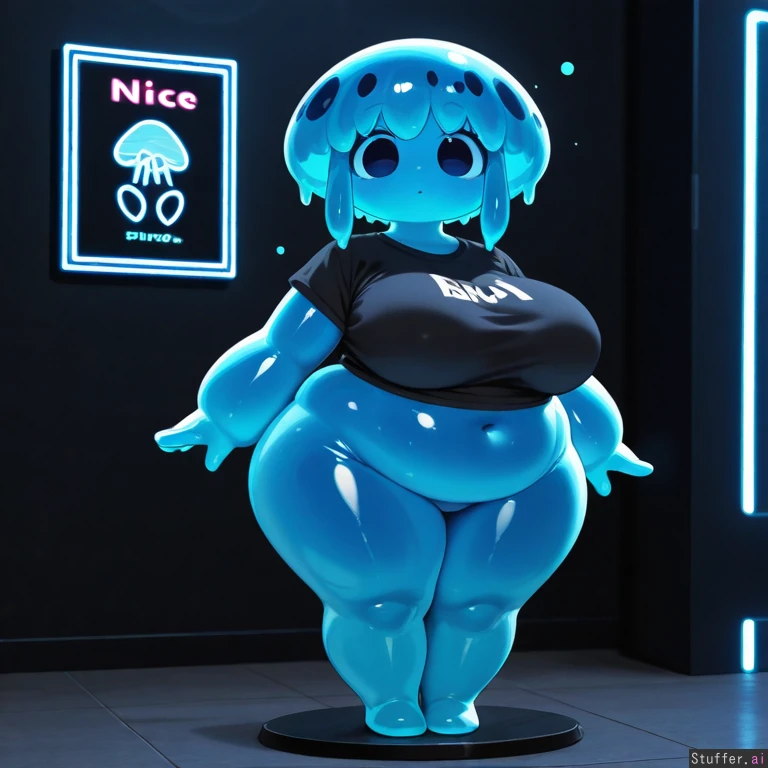 masterpiece, 8k, neon, neon lighting, glow, dynamic lighting, contrast, slime_girl, Blue slime girl, jellyfish haircut, slime hair, blue skin, blue hair, full_body, (dark blue dots for eyes, dot eyes, big eyes), no clothes, small figure, wide_hips, humanoid, (fat, chubby, bbw, nice boobs)