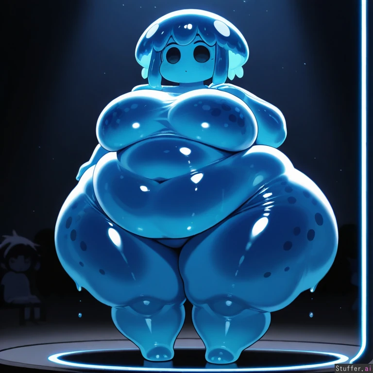 masterpiece, 8k, neon, neon lighting, glow, dynamic lighting, contrast, slime_girl, Blue slime girl, jellyfish haircut, slime hair, blue skin, blue hair, full_body, (dark blue dots for eyes, dot eyes, big eyes), no clothes, small figure, wide_hips, humanoid, (fat, chubby, bbw, nice boobs, gigantic massive fat obese ass)