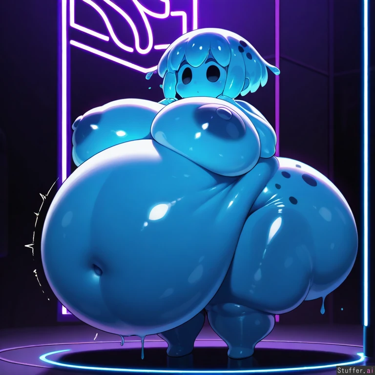 masterpiece, 8k, neon, neon lighting, glow, dynamic lighting, contrast, slime_girl, Blue slime girl, jellyfish haircut, slime hair, blue skin, blue hair, full_body, (dark blue dots for eyes, dot eyes, big eyes), no clothes, small figure, wide_hips, humanoid, (fat inflation, chubby, bbw) ((massive inflating boobs, gigantic massive fat obese ass inflation, belly overinflation))