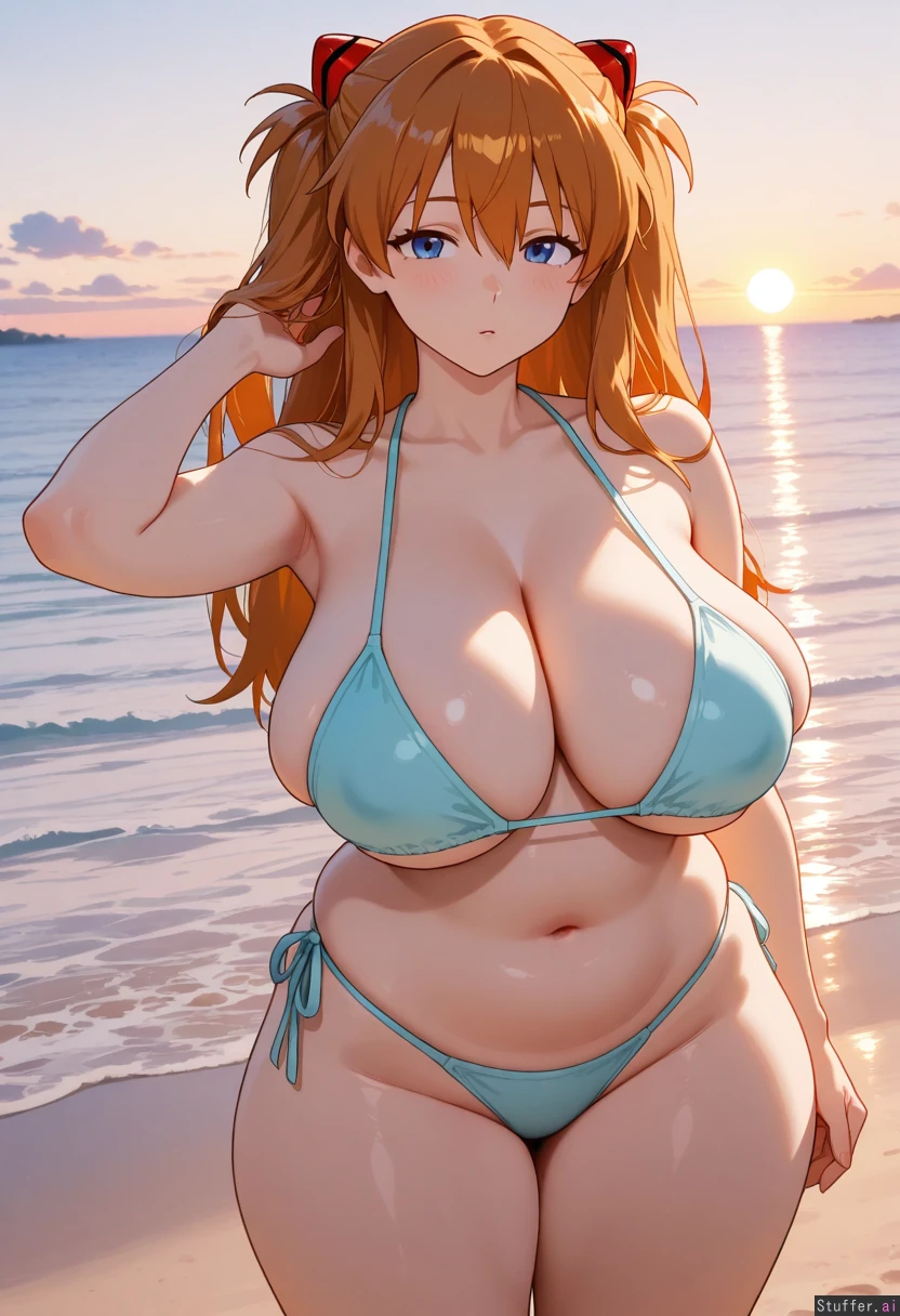highly detailed,detailed eyes,Asuka Langley,solo,mature,huge breasts,huge hips,thick thighs,full thighs,soft belly,arms,eyes half closed,Pastel colors, flat colors,soft stomach,sunset, sea,beach ,taking photos,touching hair ,looking at viewers