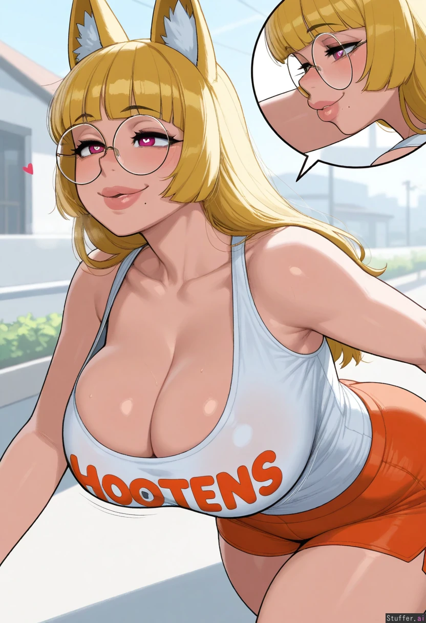 (( 1girl, solo, krekkov)) (( Mature woman, ((yellow_hair)), fox_ears, hime_cut, long_hair, pink_eyes, big_lips, mole_under_mouth, no_tail)) (( ((Hooters,White_shirt)), orange_shorts, short_shorts, round_glasses, heart_eyes)) (( morning, day, day_lighting)) (( Walking, street, side_view, bouncing_breasts, close-up, smiling, cleavage, sleeveless, breast_focus)) (( large_breasts:0.9)) (( Obese_belly:0.0)) (( thick_thighs:0.9))