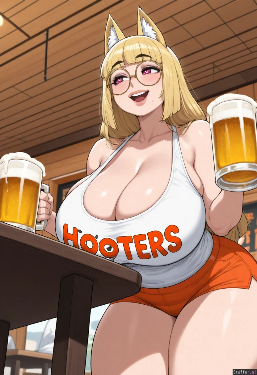 (( 1girl, solo, krekkov)) (( Mature woman, ((yellow_hair)), fox_ears, pink_eyes, heart_eyes, hime_cut, long_hair, round_glasses, big_lips, mole_under_mouth, no_tail)) (( Gigantic_breasts:0.9)) (( Obese_belly:0.0)) (( thick_thighs:0.9)) (( ((Hooters,White_shirt)), orange_shorts, short_shorts,)) (( orange_lighting)) (( Restaurant, table, leaning_foward, standing, low_angle_view, happy, looking_away, open_mouth_smile, cleavage, sleeveless, holding_beer_mug))