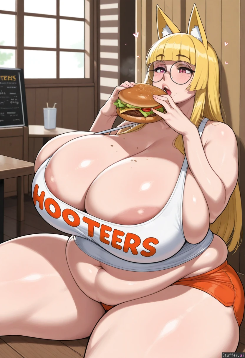 (( 1girl, solo, krekkov)) (( Mature woman, ((yellow_hair)), fox_ears, pink_eyes, heart_eyes, hime_cut, long_hair, round_glasses, big_lips, mole_under_mouth, no_tail)) (( Gigantic_breasts:1.6)) (( Obese_belly:1.3)) (( thick_thighs:1.25)) ( ((Hooters,White_shirt)), orange_shorts, short_shorts,areola_slip)) (( orange_lighting)) (( Restaurant, sitting, on_floor, wood_floor, ((side_view)), happy, cleavage, sleeveless, open_mouth,fried_chiken on floor, holding_burger, eating, Brown crumbs on cleavage, side_profile))
