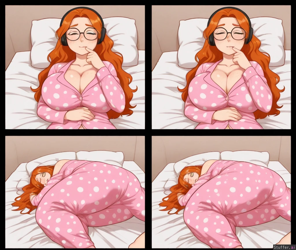 mature_female, huge_hips, long_hair, orange_hair, glasses, freckles, round_face, straight_hair, big_fupa, big_thighs, (polka_dot pajamas) laying, bed, big_belly, cleavage, sleeping, breast_expansion, headphones, lullaby, farting, soiling pants, pants full, blissful, hypnotized, regressing, solo, one girl, sucking thumb, thumb sucking, shitting, wetting, squirming, hypnotized, potty, bedwetter, embarrassed, thumb in mouth, wetting the bed, relaxed
