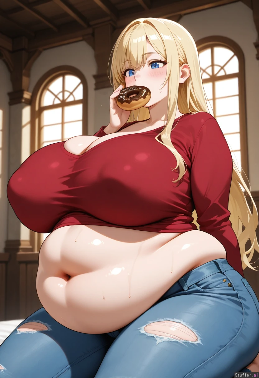 (exquisite quality, extremely detailed, realistic anime style, masterpiece, absurdres, one girl, solo, sin of gluttony, hellish punishment, torso side view). A sexy girl kneeling. (Wearing a torn long red shirt and torn low rise jeans). 25 years old. Fluffy long blonde hair. Beautiful blue eyes. Blushing, cute face (Ssbbw huge belly, huge fat waist, )(bulging fat love-handles), (belly bulge), (huge chubby legs), (huge boobs) (big bloated full belly) (belly has 2 rolls) (legs and ass are so fat) (clothes way to tight) (girl is a hundred times fatter than current picture) (the girls belly is expanding out of frame)(Girls belly is grown past her boobs) (girls belly is bigger than current picture) (girls belly covers length of thighs) (girls fat is bursting all the seams of her clothes) (girl is two times fatter than current image) (girls belly hangs out farther than her boobs) (girls belly and ass and hips are twice as big as current image) (girl gains another hundred pounds of fat on to belly) (girls ass is to fat for her jeans) (girl is so fat she can't move) (girl is immobile from being so fat) (belly is bursting out of shirt), (boobs are bursting out of shirt) (belly is bloated and huge), (belly keeps growing bigger) (belly keeps growing bigger),(belly keeps growing bigger),(belly keeps growing bigger)(belly keeps growing bigger) (belly is way bigger than current image) (girl has way more fat on her body) Dark dungeon background. (Another person force-feeding her donuts), (shoving a donut into her mouth)) , (girl gains 100 pounds of fat) , )big huge belly)(fatter than current image) , (girl can't stop eating) , ( girl is so fat she's being weighed down by her belly) , (belly busting) , (belly is growing down her legs about to touch her knees) , (girl is 200 pounds fatter than current image) , (girls clothes are to tight belly is so fat) , (belly hanging) ,( belly 2 feet long)