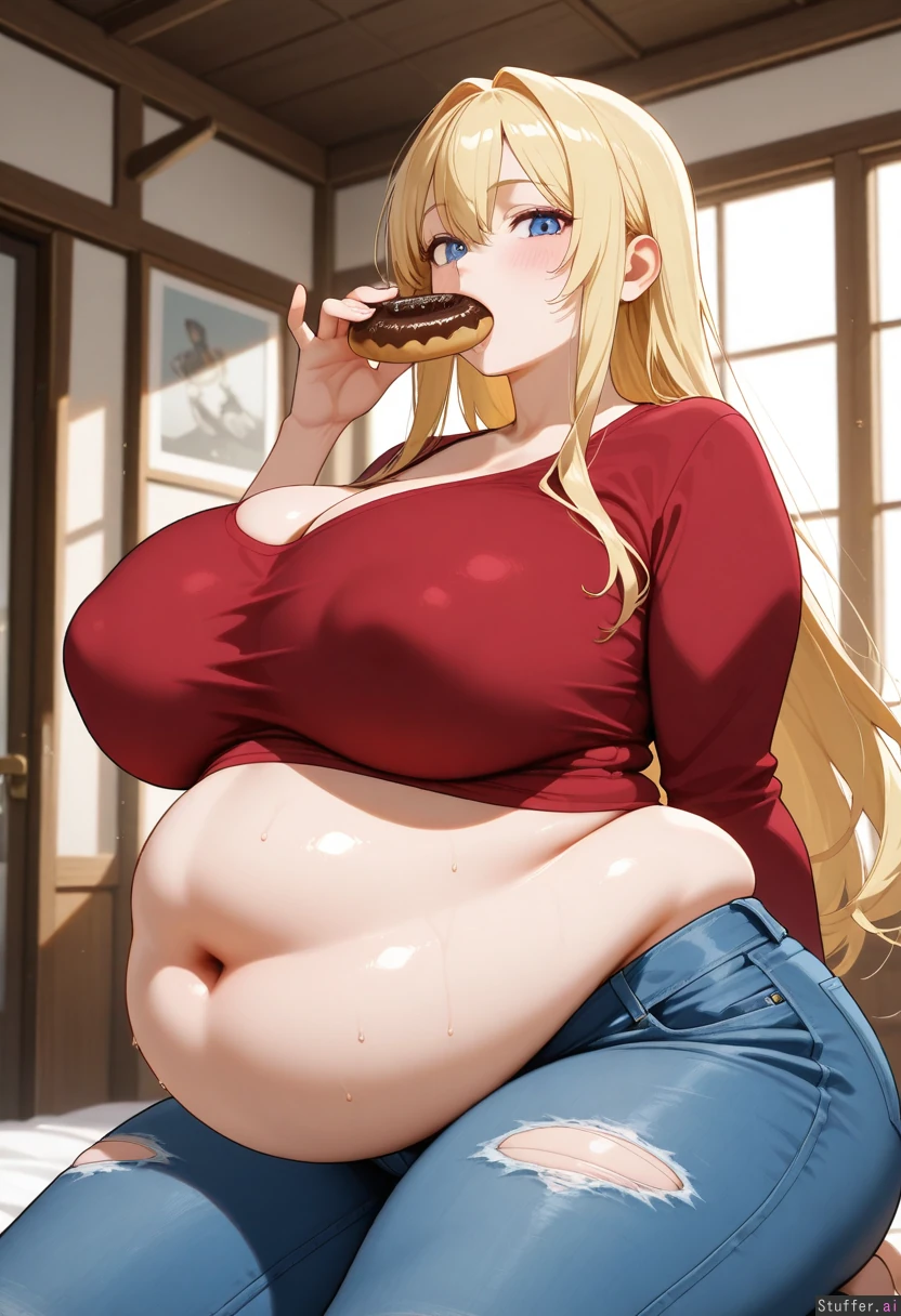 (exquisite quality, extremely detailed, realistic anime style, masterpiece, absurdres, one girl, solo, sin of gluttony, hellish punishment, torso side view). A sexy girl kneeling. (Wearing a torn long red shirt and torn low rise jeans). 25 years old. Fluffy long blonde hair. Beautiful blue eyes. Blushing, cute face (Ssbbw huge belly, huge fat waist, )(bulging fat love-handles), (belly bulge), (huge chubby legs), (huge boobs) (big bloated full belly) (belly has 2 rolls) (legs and ass are so fat) (clothes way to tight) (girl is a hundred times fatter than current picture) (the girls belly is expanding out of frame)(Girls belly is grown past her boobs) (girls belly is bigger than current picture) (girls belly covers length of thighs) (girls fat is bursting all the seams of her clothes) (girl is two times fatter than current image) (girls belly hangs out farther than her boobs) (girls belly and ass and hips are twice as big as current image) (girl gains another hundred pounds of fat on to belly) (girls ass is to fat for her jeans) (girl is so fat she can't move) (girl is immobile from being so fat) (belly is bursting out of shirt), (boobs are bursting out of shirt) (belly is bloated and huge), (belly keeps growing bigger) (belly keeps growing bigger),(belly keeps growing bigger),(belly keeps growing bigger)(belly keeps growing bigger) (belly is way bigger than current image) (girl has way more fat on her body) (girl is way more fatter than current image) (girl has another 100 pounds gained into belly and ass from current image) (girl has more fat on belly and ass) (girls belly is twice as fat as current image) (girls belly is huge bigger than imaginable) (girl has more belly rolls) Dark dungeon background. (Another person force-feeding her donuts), (shoving a donut into her mouth)) , (girl gains 100 pounds of fat) , )big huge belly)(fatter than current image) , (girl can't stop eating) , ( girl is so fat she's being weighed down by her belly) , (belly busting) , (belly is growing down her legs about to touch her knees) , (girl is 200 pounds fatter than current image) , (girls clothes are to tight belly is so fat) , (belly hanging) ,( belly 2 feet long)