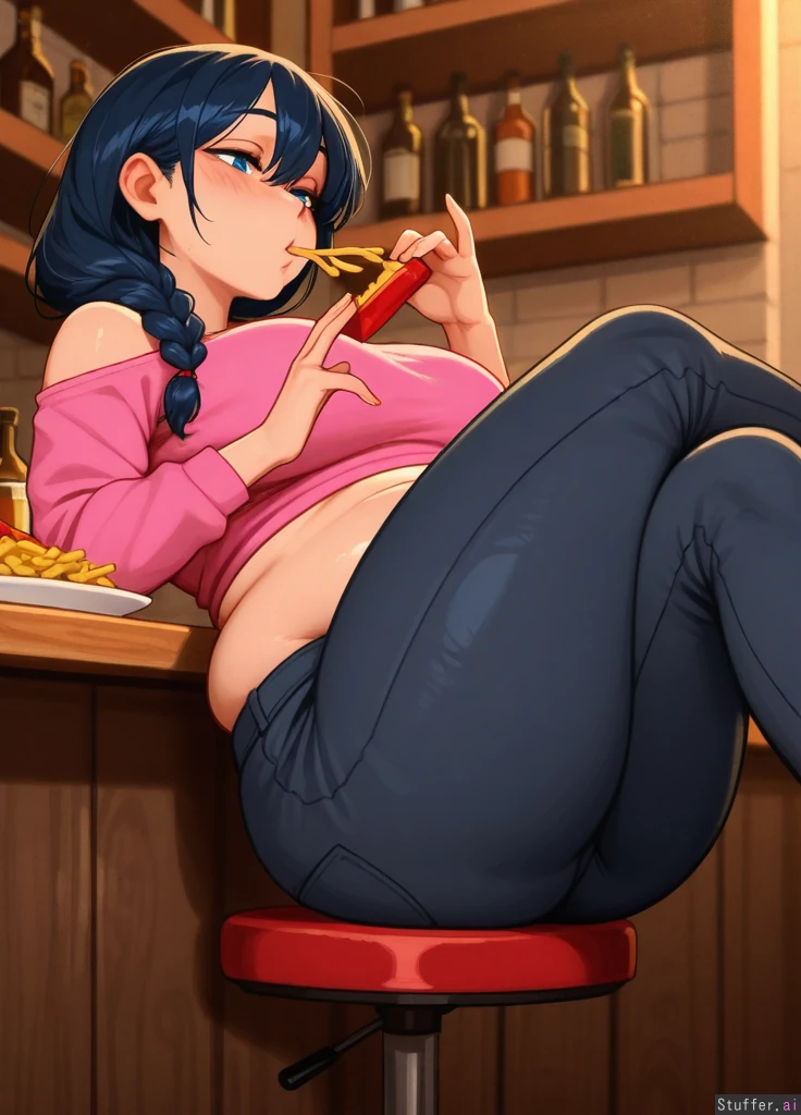 (Krekkov(artist)), (Kittew(artist)), (Khyle(artist)), (Colourful colour pallet), (SOLO), (Beautiful natural woman), (Blue eyes), (Braided black hair), (Drunk), (Intoxicated), (Black jeans), (Pink top), (Huge lower belly roll), (Soft chubby belly) (Big firm thighs), (Perfect chubby belly), (Bottom heavy), (Sitting on bar stool eating fries on a plate), looking at hands, empty alcohol bottles on table, playing with hair (Side view), (Crossed legs), Detailed light shading, warm light
