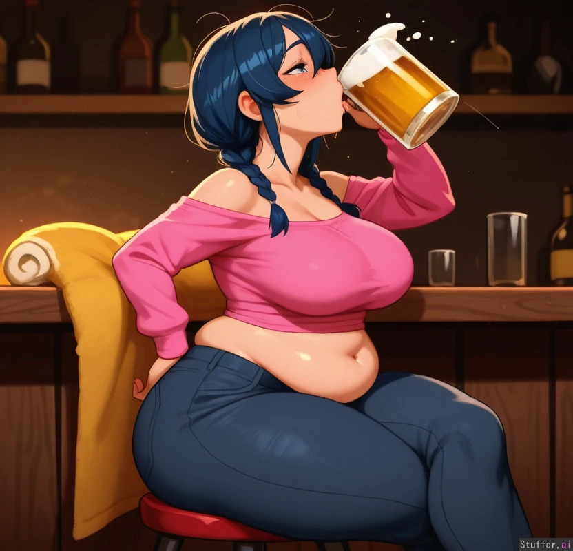 (Krekkov(artist)), (Kittew(artist)), (Khyle(artist)), (Colourful colour pallet), Bigger lower body Sipping big mug of beer Mouth dripping beer Wet shirt Chug Drinking Looking up Mouth wide open Closed eyes (SOLO), (Beautiful natural woman), (Blue eyes), (Braided black hair), (Drunk), (Intoxicated), (Black jeans), (Pink top), (Huge lower belly roll), (Soft chubby belly) ( Belly rolls) (Big firm thighs), (Perfect chubby belly), (Bottom heavy), Wide hips (Sitting on bar stool), (Side view), (Crossed legs), Detailed light shading, warm light