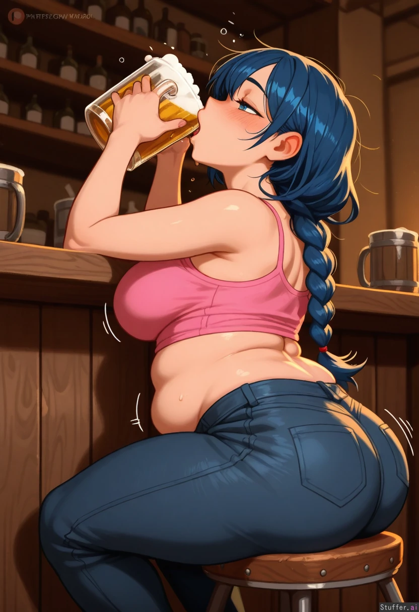 (Krekkov(artist)), (Kittew(artist)), (Khyle(artist)), (Colourful colour pallet), Bigger lower body Sipping big mug of beer Chug Drinking Looking up Mouth wide open Mouth dripping Closed eyes Motion lines (SOLO), (Beautiful natural woman), (Blue eyes), (Braided black hair), (Drunk), (Intoxicated), (Black jeans), (Pink top), (Fat lower belly roll), (Fat back rolls and folds) (Soft chubby belly) Big ass ( Belly rolls) (Big firm thighs), (Perfect chubby belly), (Bottom heavy), Wide hips (Sitting on bar stool), (Side view), Detailed light shading, warm light