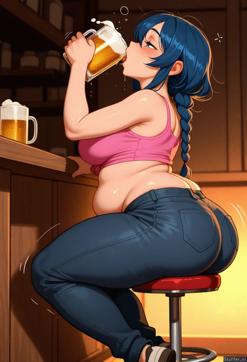 (Krekkov(artist)), (Kittew(artist)), (Khyle(artist)), (Colourful colour pallet), Bigger lower body Sipping big mug of beer Chug Drinking Looking up Mouth wide open Mouth dripping Closed eyes Motion lines (SOLO), (Beautiful natural woman), (Blue eyes), (Braided black hair), (Drunk), (Intoxicated), (Black jeans), (Pink top), (Fat lower belly roll), (Fat back rolls and folds) (Soft chubby belly) Belly over hips Big ass ( Belly rolls) (Big firm thighs), (Perfect chubby belly), (Bottom heavy), Wide hips (Sitting on bar stool), (Side view), Detailed light shading, warm light