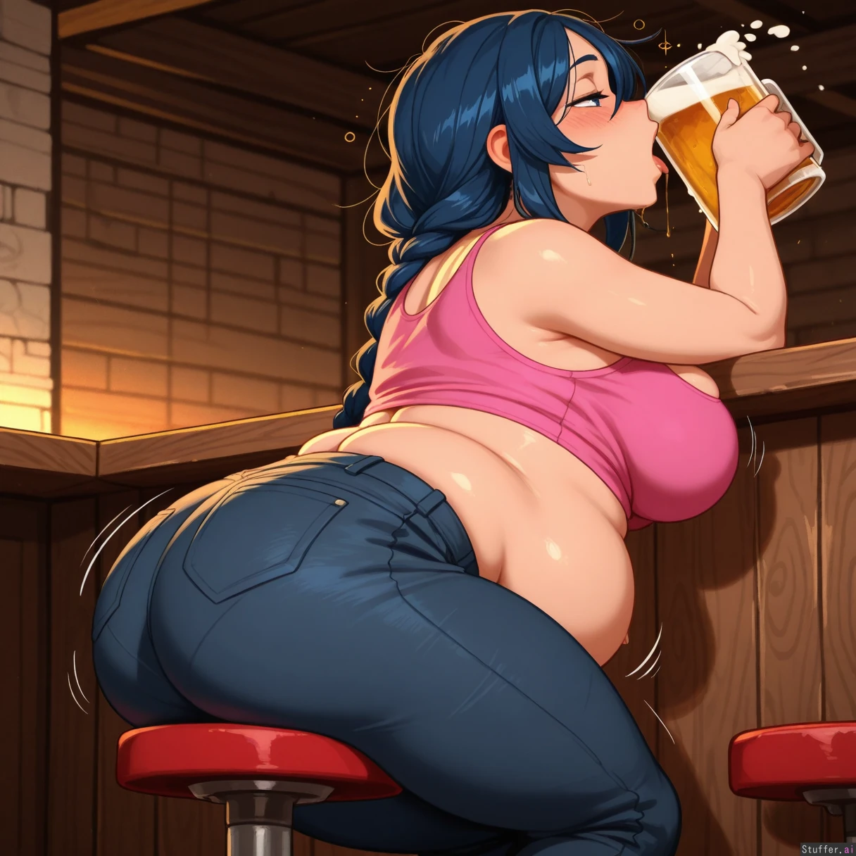 (Krekkov(artist)), (Kittew(artist)), (Khyle(artist)), (Colourful colour pallet), Bigger lower body Sipping big mug of beer Chug Drinking Looking up Mouth wide open Mouth dripping Closed eyes Motion lines (SOLO), (Beautiful natural woman), (Blue eyes), (Braided black hair), (Drunk), (Intoxicated), (Black jeans), (Pink top), (Fat lower belly roll), (Fat back rolls and folds) (Soft chubby belly) Belly over hips Big ass ( Belly rolls) (Big firm thighs), (Perfect chubby belly), (Bottom heavy), Wide hips (Layed confortably on bar stool), (Side view), Detailed light shading, warm light