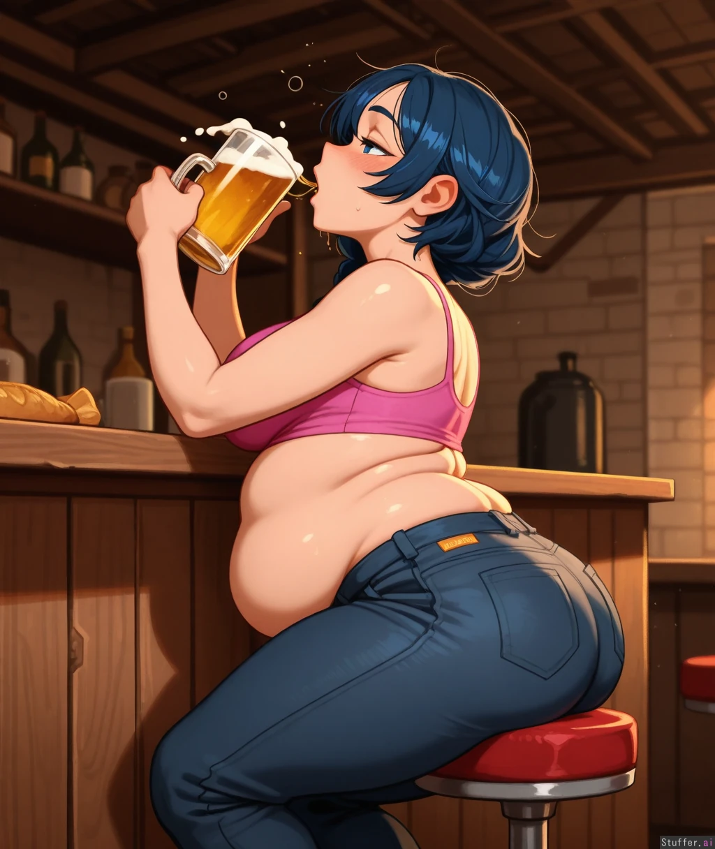 (Krekkov(artist)), (Kittew(artist)), (Khyle(artist)), (Colourful colour pallet), Bigger lower body Sipping big mug of beer (holding mug with both hands) Chug Drinking Looking up Mouth wide open Mouth dripping (SOLO), (Beautiful natural woman), (Blue eyes), (Braided black hair), (Drunk), (Intoxicated), (Black jeans), (Pink top), (Fat lower belly roll), (Fat back rolls and folds) (Soft chubby belly) Belly over hips Big ass ( Belly rolls) (Big firm thighs), (Perfect chubby belly), (Bottom heavy), Wide hips (Sitted on bar stool), (Side view), Detailed light shading, warm light