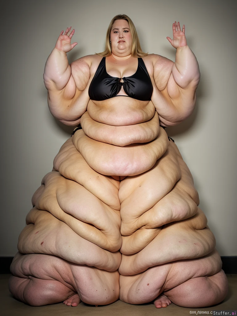 Photo realistic, highly detailed, realistic lighting, blonde ssbbw, standing, beautiful face, (wearing a black bikini:1.4) , (ultra double chin:1.8), (ultra fat face:1.8), ultra huge arms:1.9), (ultra huge legs:1.9), (ultra leg rolls:1.7), (ultra huge calves:1.8), (cellulite:1.5), ultra fat ankles:1.8), bare feet:1.4