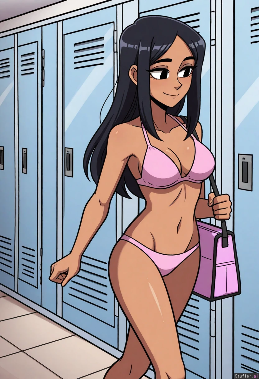 best quality, high rating, ((high rating:1.25)), bright colors, scruffyturtles(artist), vanripper(artist), (perfect face), (detailed face), (perfect hands), ((1girl)), ((solo)) Dark skin, black hair, long straight hair, visible forehead, black eyes, light pink bikini, latina, thin, short, medium breasts, small belly, thin hips, thin thighs, small butt, legs, at beach, walking, happy, closed mouth, wall, locker room, open bag,