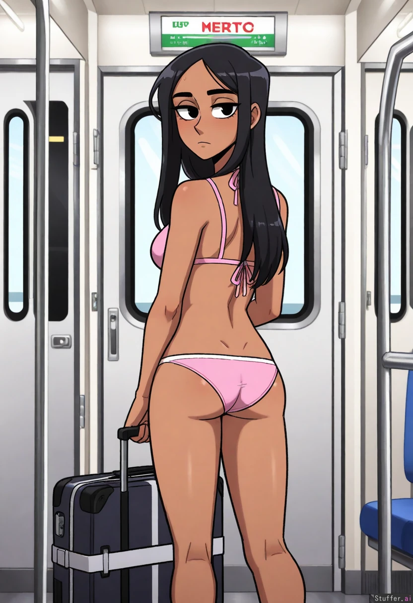 best quality, high rating, ((high rating:1.25)), bright colors, scruffyturtles(artist), vanripper(artist), (perfect face), (detailed face), (perfect hands), ((1girl)), ((solo)) Dark skin, black hair, long straight hair, visible forehead, black eyes, light pink bikini, latina, thin, short, medium breasts, small belly, thin hips, thin thighs, small butt, legs, In a metro, standing, close mouth, open bag, luggage, looking behind,