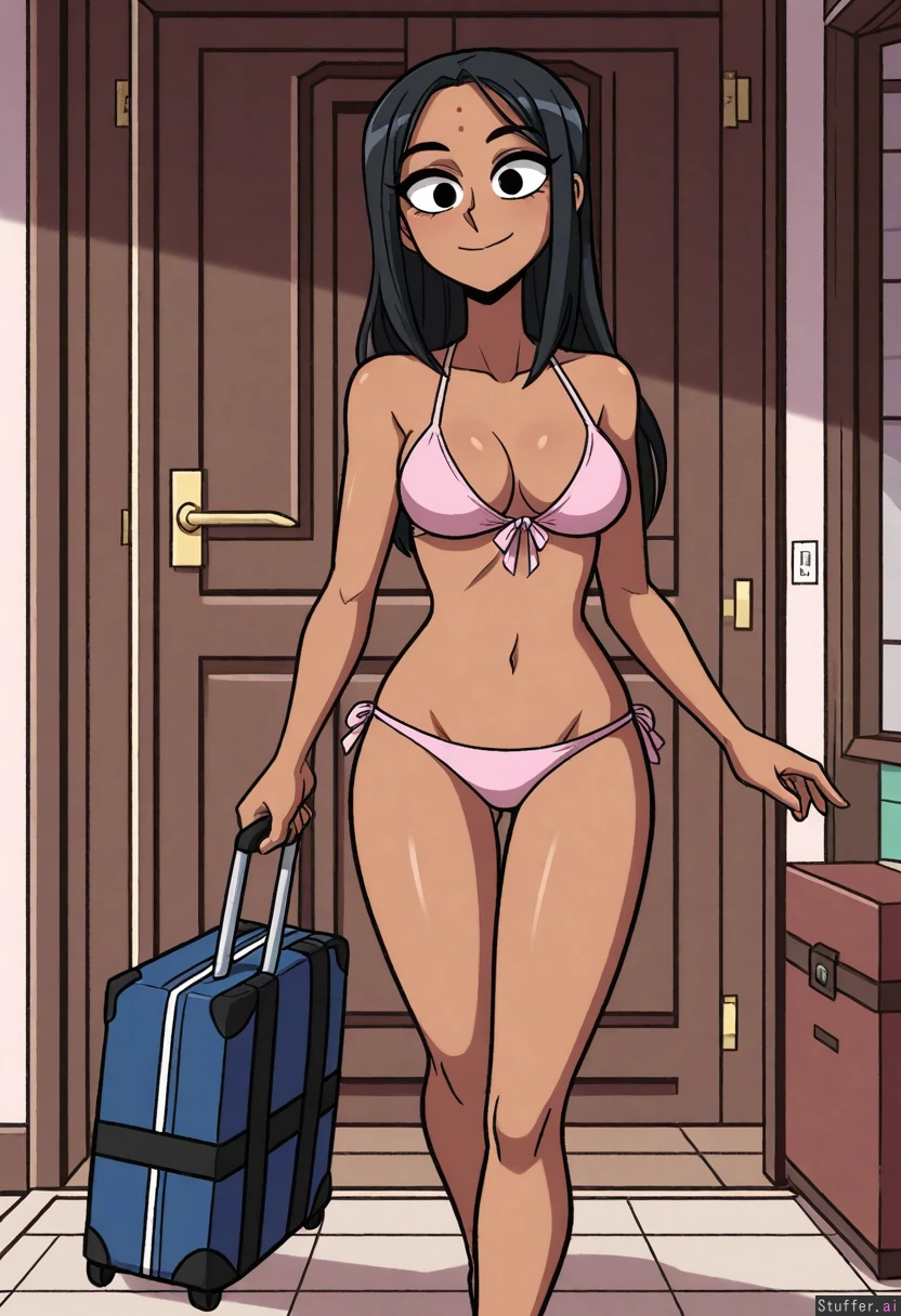 best quality, high rating, ((high rating:1.25)), bright colors, scruffyturtles(artist), vanripper(artist), (perfect face), (detailed face), (perfect hands), ((1girl)), ((solo)) Dark skin, black hair, long straight hair, visible forehead, black eyes, light pink bikini, latina, thin, short, medium breasts, small belly, thin hips, thin thighs, small butt, legs, In a livingroom, walking, happy, close mouth, open bag, luggage, door,