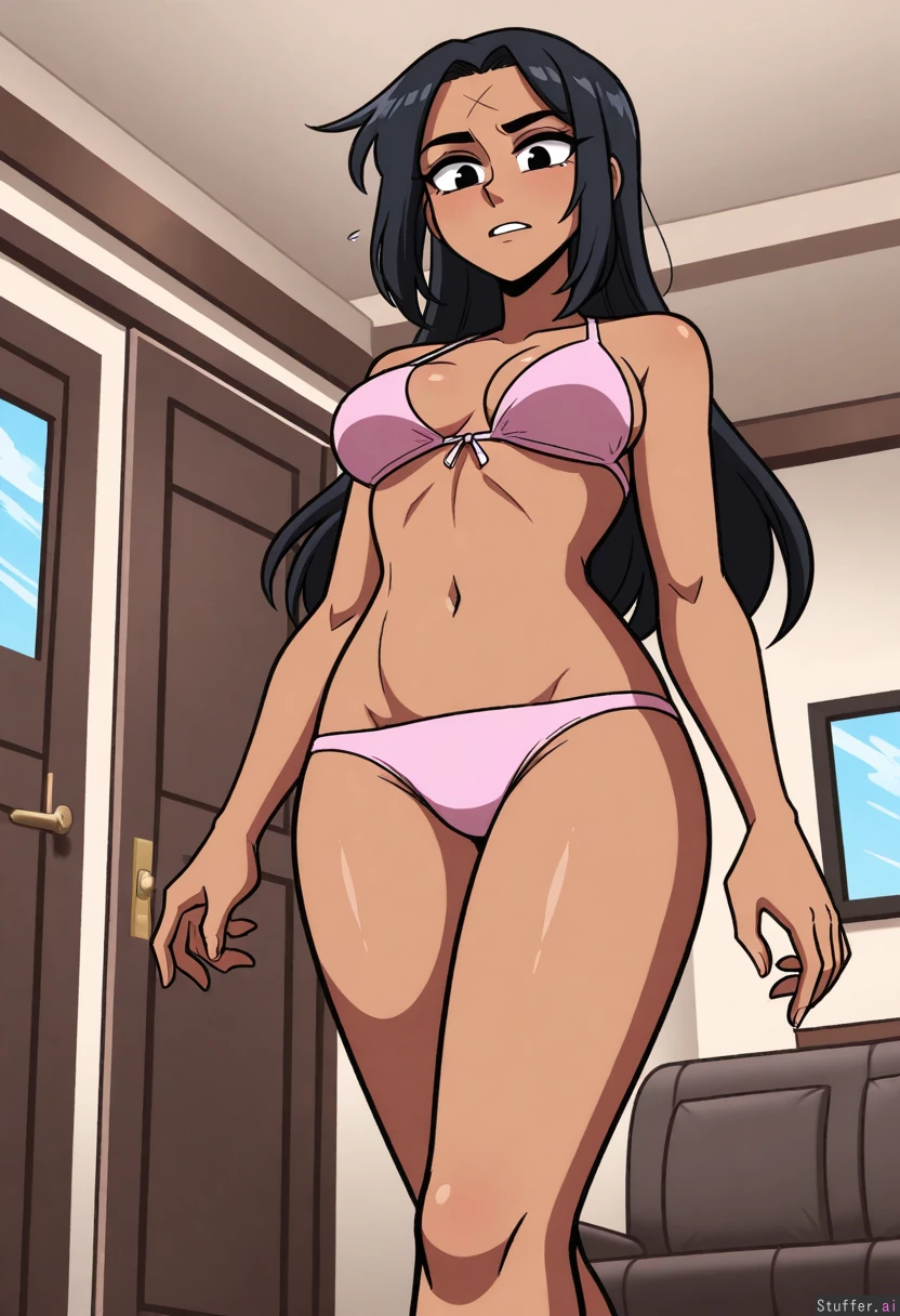 best quality, high rating, ((high rating:1.25)), bright colors, scruffyturtles(artist), vanripper(artist), (perfect face), (detailed face), (perfect hands), ((1girl)), ((solo)) Dark skin, black hair, long straight hair, visible forehead, black eyes, light pink bikini, latina, thin, short, medium breasts, small belly, thin hips, thin thighs, small butt, In a living room, walking, shock, close mouth, hungry, stomach growling, viewed from below