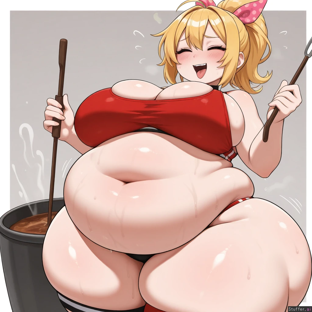 absurdres, 8k, perfect anatomy, masterpiece, beautiful face, beautiful eyes, RockSolidArt. /(artist/), RockSolidArt(artist/) ,8), (merunyaa), (usa37107692:1.2), (ohasi_art), (betterwithsalt), 1girl, blonde hair, ponytail, red sports_bra, bottomless, ((Girl has chubby pot belly and big breasts and wide hips and massive thighs and soft face and chubby and gigantic_hyper_ass:1.8)), standing and holding belly in her hands. she is very flustered , she is very horny, she is hot and bothered, open mouth, tongue out, panting heavily, sweaty, pink ribbon in ponytail, eyes closed, ahegao, cumming, cumflation,