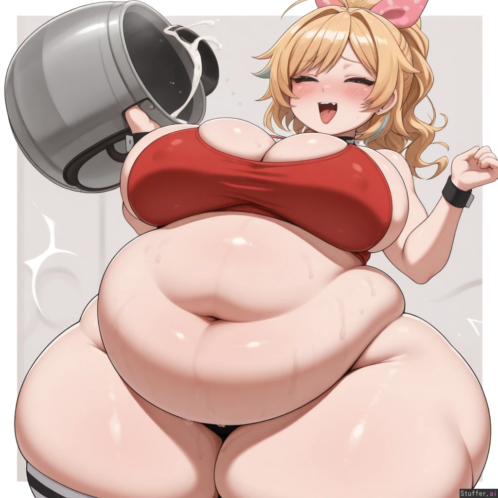 absurdres, 8k, perfect anatomy, masterpiece, beautiful face, beautiful eyes, RockSolidArt. /(artist/), RockSolidArt(artist/) ,8), (merunyaa), (usa37107692:1.2), (ohasi_art), (betterwithsalt), 1girl, blonde hair, ponytail, red sports_bra, bottomless, ((Girl has chubby pot belly and big breasts and wide hips and massive thighs and soft face and chubby and gigantic_hyper_ass:1.9)), standing and holding belly in her hands. she is very flustered , she is very horny, she is hot and bothered, open mouth, tongue out, panting heavily, sweaty, pink ribbon in ponytail, eyes closed, ahegao, cumming, cumflation,