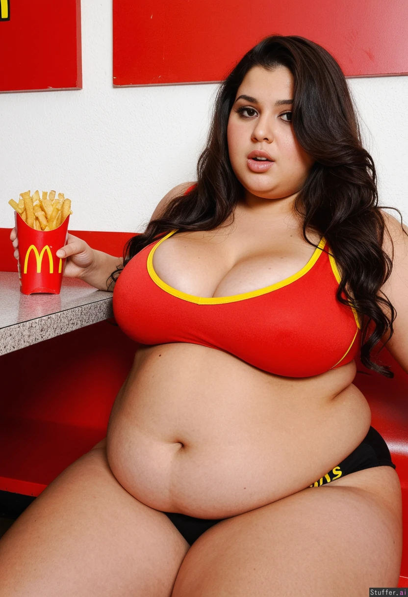 morrocan indian, beautiful model face, curvy voluptuous body, bottom heavy, wide hips, wide waist, sitting in Macdonalds eating fries , (long wavy hair, caramel skin, plump body, obese, overflowing belly, bulging belly, (huge obese belly), (big cleavage, large giant breasts), uncovered belly, lowered shorts, she is a feedee, ssbbw, she is fattening herself, overfeed obese Bright red Stretch marks (Black thongs, yellow tank top) more realistic,