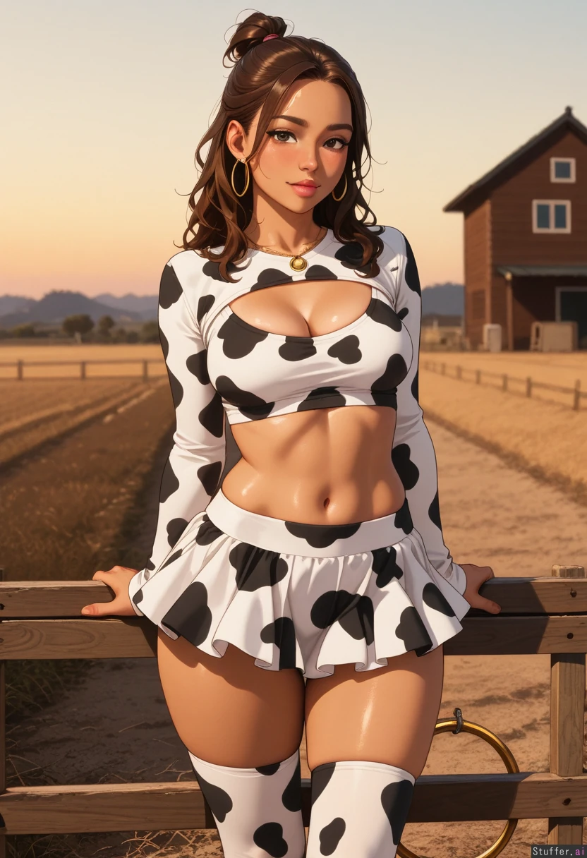 Perfect face, tanned skin, sharp jawline, 21 years old, long wavy brown hair, hair tied up, dark green brown eyes, brown eyebrows, nose piercing, golden hoop earrings, fat lips, pink lips, blush makeup, golden necklace, realistic face, beautiful legs, Medium breasts, wide hips, Fit, athletic body, thin, slim, Standing, farm, daytime, golden hour, Cow crop top, long sleeves, cow mini skirt, cow stockings, horny expression, flirting with viewer, has a crush on the viewer, (stuffed belly, potbelly, love handles, chubby, obese, spilling belly, belly rolls, bulging belly: 0.6 )