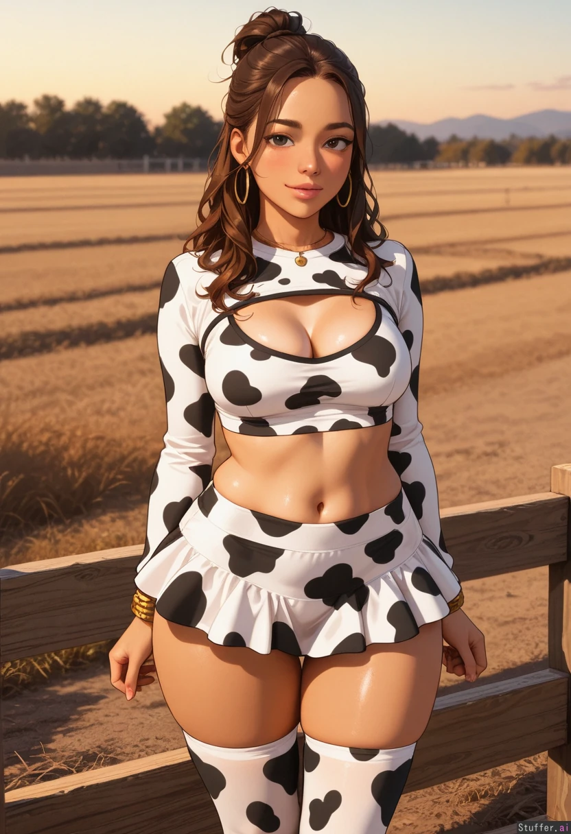Perfect face, tanned skin, sharp jawline, 21 years old, long wavy brown hair, hair tied up, dark green brown eyes, brown eyebrows, nose piercing, golden hoop earrings, fat lips, pink lips, blush makeup, golden necklace, realistic face, beautiful legs, Medium breasts, wide hips, (Fit, athletic body, thin, slim: 0.0 ) Standing, farm, daytime, golden hour, Cow crop top, long sleeves, cow mini skirt, cow stockings, horny expression, flirting with viewer, has a crush on the viewer, (stuffed belly, potbelly, love handles, chubby, obese, spilling belly, belly rolls, bulging belly: 0.0 )
