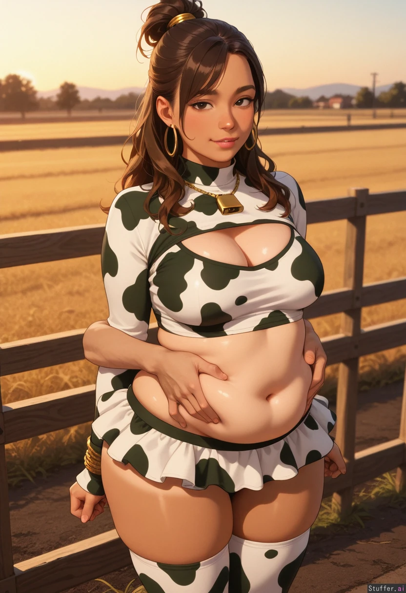 ((Perfect face)), tanned skin, sharp jawline, 21 years old, long wavy brown hair, hair tied up, dark green brown eyes, brown eyebrows, nose piercing, golden hoop earrings, fat lips, pink lips, blush makeup, golden necklace, realistic face, beautiful legs, Medium breasts, wide hips, (Fit, athletic body, thin, slim: 0.0 ) Standing, farm, daytime, golden hour, Cow crop top, long sleeves, cow mini skirt, cow stockings, Disembodied hands grabbing belly, horny expression, flirting with viewer, has a crush on the viewer, (stuffed belly, potbelly, love handles, chubby, obese, spilling belly, belly rolls, bulging belly: 0.8 )