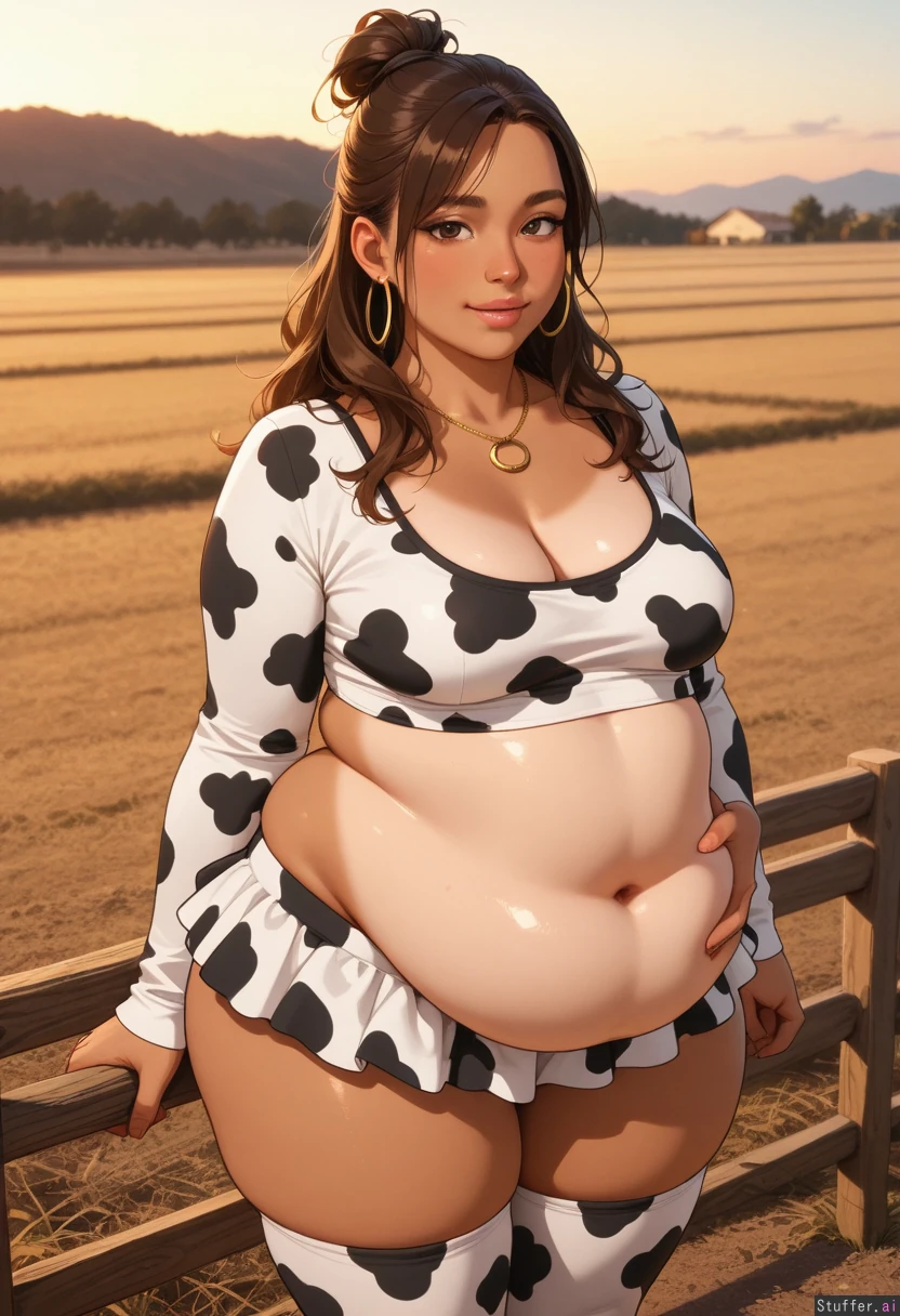 ((Perfect face)), tanned skin, sharp jawline, 21 years old, long wavy brown hair, hair tied up, dark green brown eyes, brown eyebrows, nose piercing, golden hoop earrings, fat lips, pink lips, blush makeup, golden necklace, realistic face, beautiful legs, Medium breasts, wide hips, (Fit, athletic body, thin, slim: 0.0 ) Standing, farm, daytime, golden hour, Cow crop top, long sleeves, cow mini skirt, cow stockings, horny expression, flirting with viewer, has a crush on the viewer, (stuffed belly, potbelly, love handles, chubby, obese, spilling belly, belly rolls, bulging belly: 0.95 )