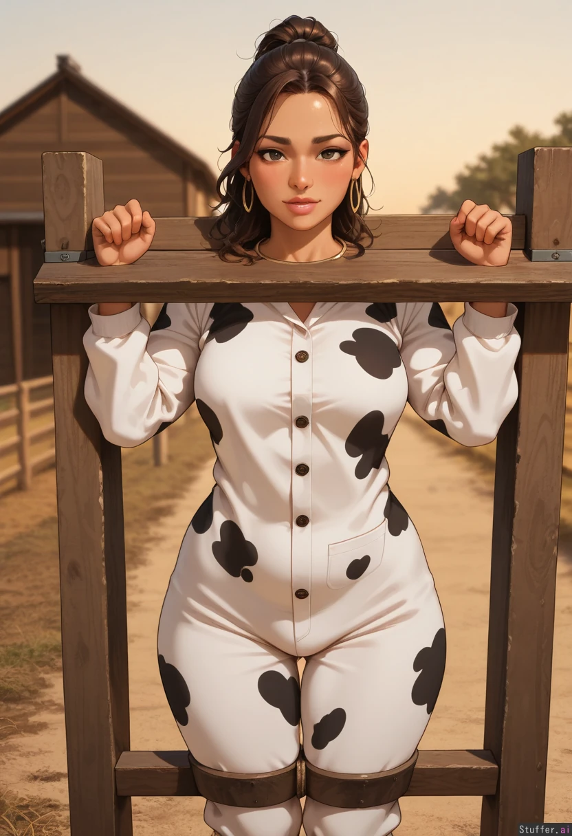 ((Perfect face)), ((tanned skin)), sharp jawline, 21 years old, long wavy brown hair, hair tied up, dark green brown eyes, brown eyebrows, nose piercing, golden hoop earrings, fat lips, pink lips, blush makeup, golden necklace, realistic face, beautiful legs, Medium breasts, wide hips, (Fit, athletic body, thin, slim: 1 ) head and wrists in stocks, pillory, Standing, farm, daytime, golden hour, Cow onesie with buttons, horny expression, flirting with viewer, has a crush on the viewer, (stuffed belly, potbelly, love handles, chubby, obese, spilling belly, belly rolls, bulging belly: 0.0 )