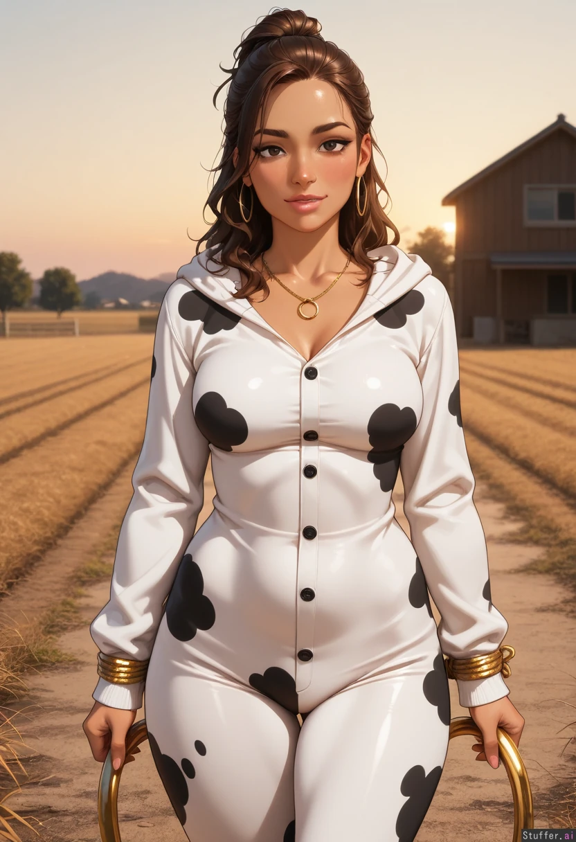 1girl, ((Perfect face)), ((tanned skin)), sharp jawline, 21 years old, long wavy brown hair, hair tied up, dark green brown eyes, brown eyebrows, nose piercing, golden hoop earrings, fat lips, pink lips, blush makeup, golden necklace, realistic face, beautiful legs, Medium breasts, wide hips, Fit, athletic body, thin, slim, Standing, farm, daytime, golden hour, Cow onesie with buttons, tight clothes, horny expression, flirting with viewer, has a crush on the viewer, (stuffed belly, potbelly, love handles, chubby, obese, spilling belly, belly rolls, bulging belly: 0.0 )