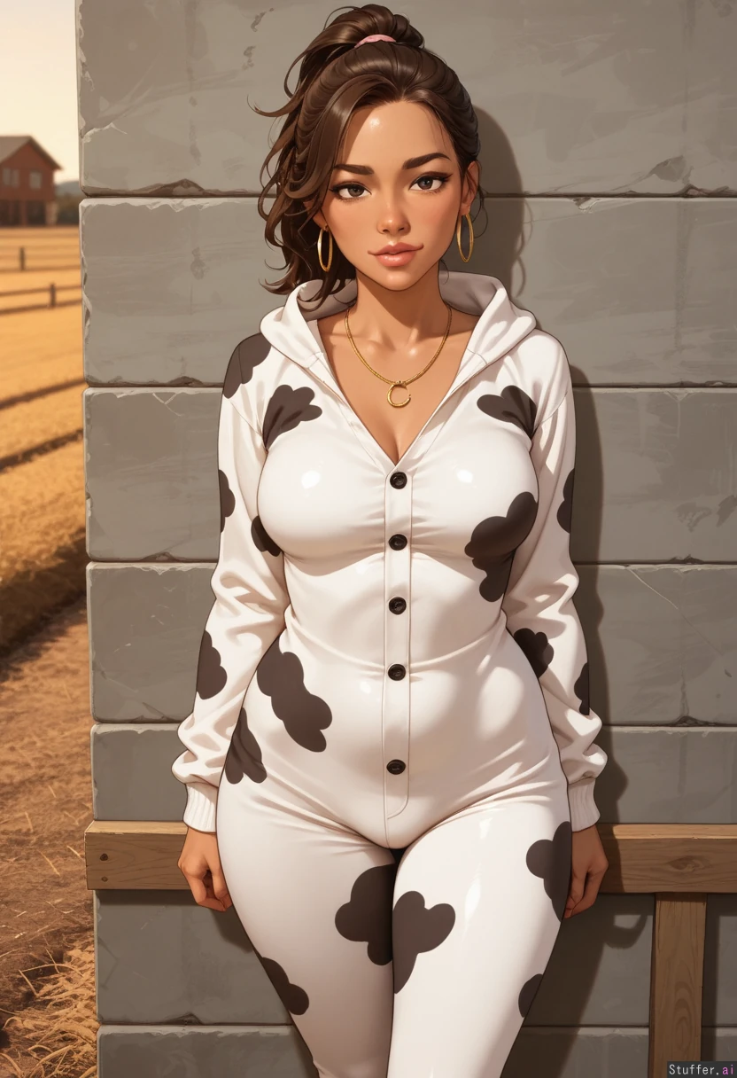 1girl, ((Perfect face)), ((tanned skin)), sharp jawline, 21 years old, long wavy brown hair, hair tied up, dark green brown eyes, brown eyebrows, nose piercing, golden hoop earrings, fat lips, pink lips, blush makeup, golden necklace, realistic face, beautiful legs, Medium breasts, wide hips, Fit, athletic body, thin, slim, Standing against wall, farm, daytime, golden hour, Cow onesie with buttons, tight clothes, horny expression, flirting with viewer, has a crush on the viewer, (stuffed belly, potbelly, love handles, chubby, obese, spilling belly, belly rolls, bulging belly: 0.0 )